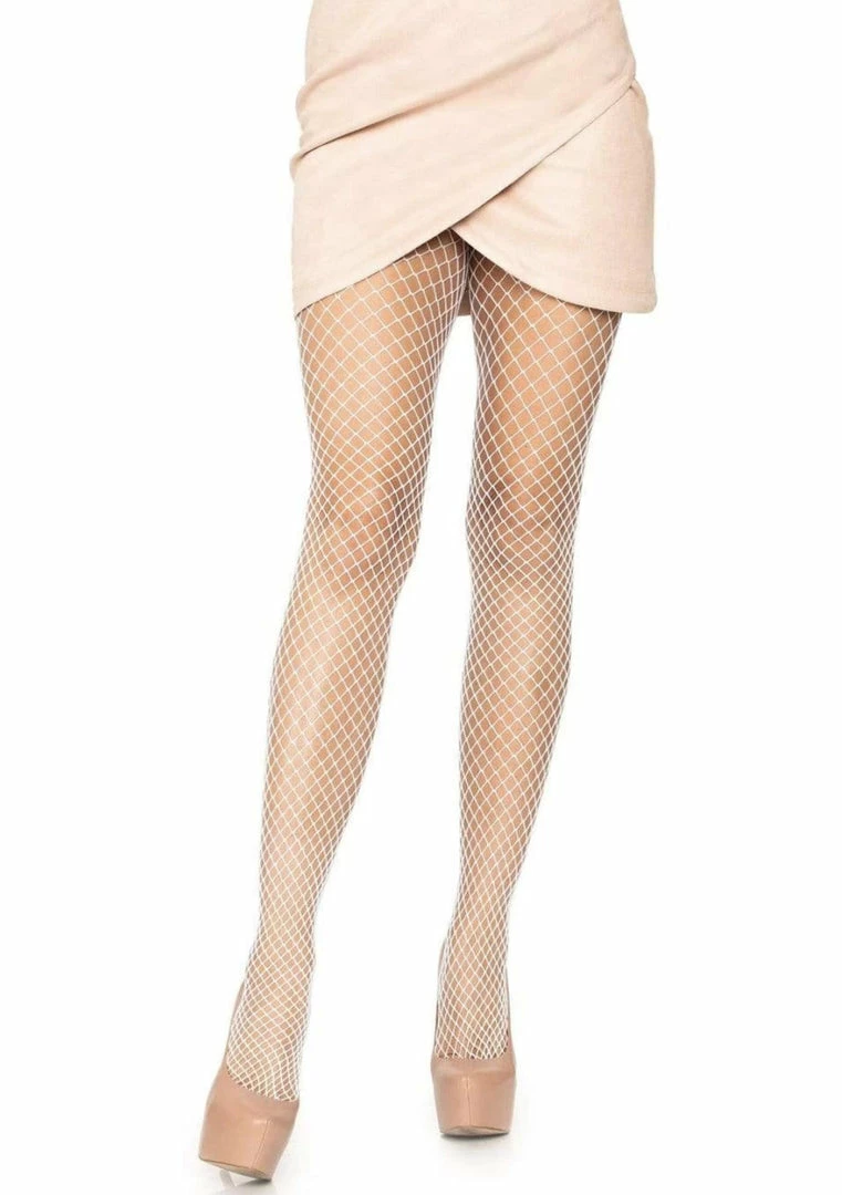 Spandex INDUSTRIAL net tights in white color. These are perfect to wear with pin-up clothing or under a cosplay costume. They are a large fishnet and go up to the waist as pantyhose.