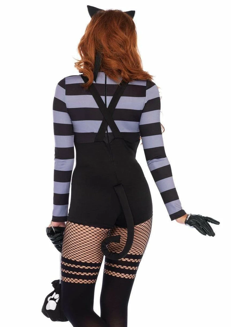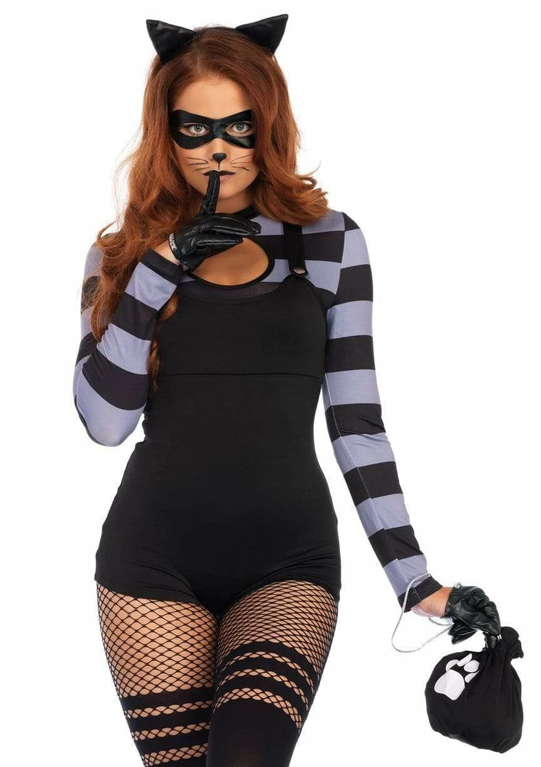 Try not to trip any alarm systems in this Cat Burglar costume! With a cute striped romper, eye mask, and ears you can keep your identity a mystery. You can laugh all the way to the bank with a paw print money bag after the job is successful.Â