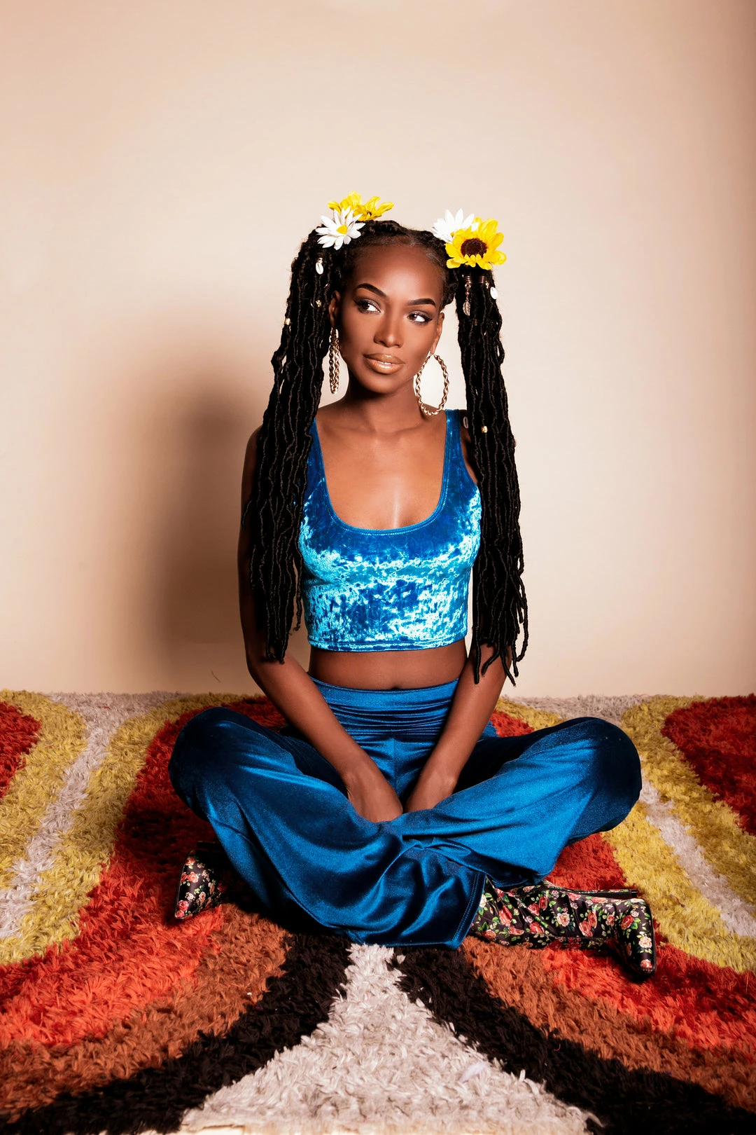 These super retro Teal Plush Velvet Flare Pants have that vintage retro look of the 70s. Just enough of a Bell Bottom to have the retro look, but still able to move around easily. Pair it with our cute crushed velvet turquoise tank like we did for a kyoooot monochromatic look!