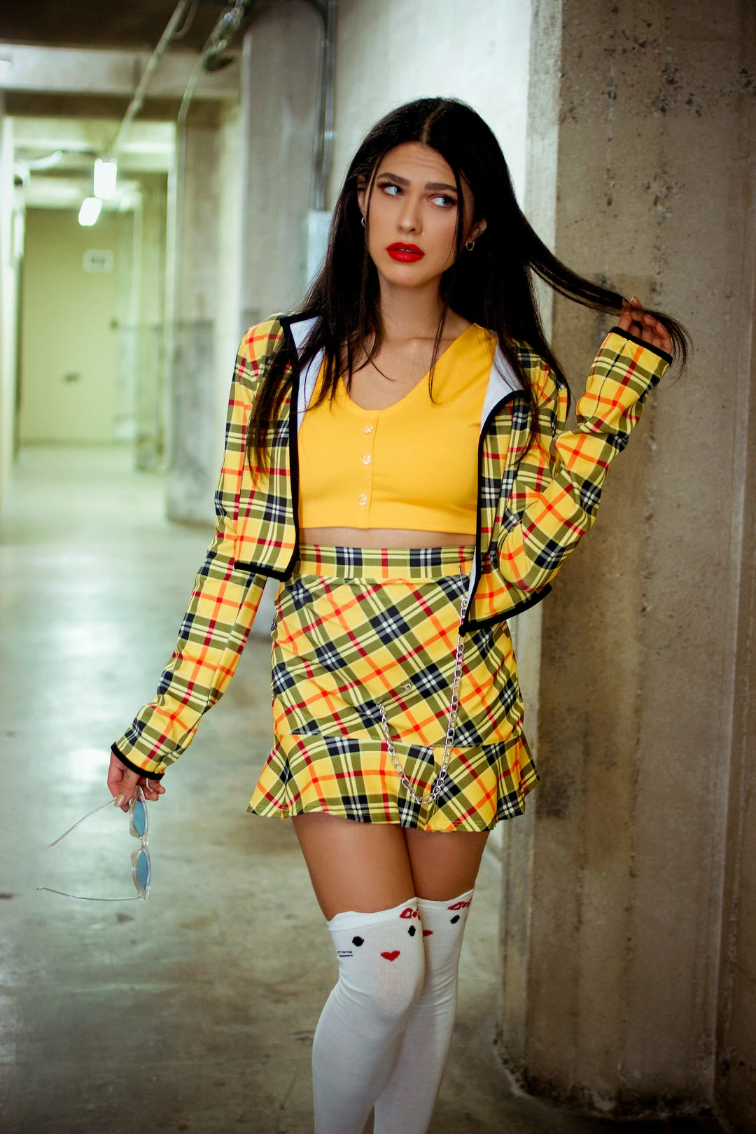 Our Sugarpuss Yellow Plaid Set comes with a high-waisted skirt with safety pins and chain details! (Super on point!) The yellow crop vest can be worn by itself as a top or over a white tee, like Cher. Our jacket is a simplified version of her blazer. It is slightly cropped and perfectly matches the set to complete the look!