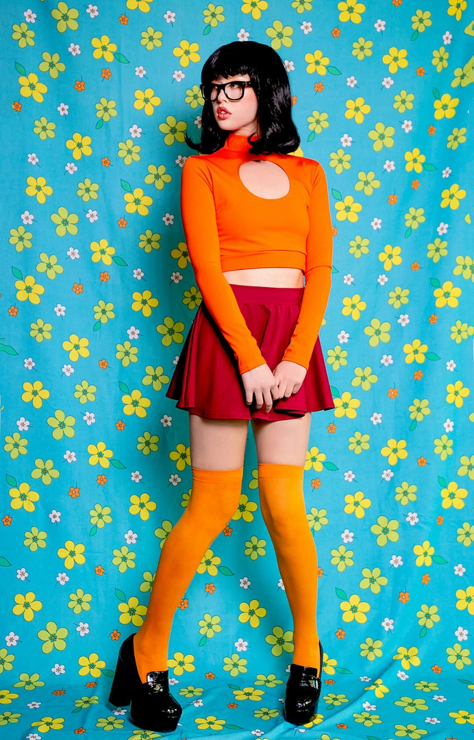 Our Schoolgirl Brains of the Mystery Gang Set comes with a long sleeve mockneck crop top with a flirty keyhole cut-out and burgundy high-waisted skater skirt. Whether you are headed to a costume party or channeling your inner BRAINS of the group this set is perfect for any occasion!