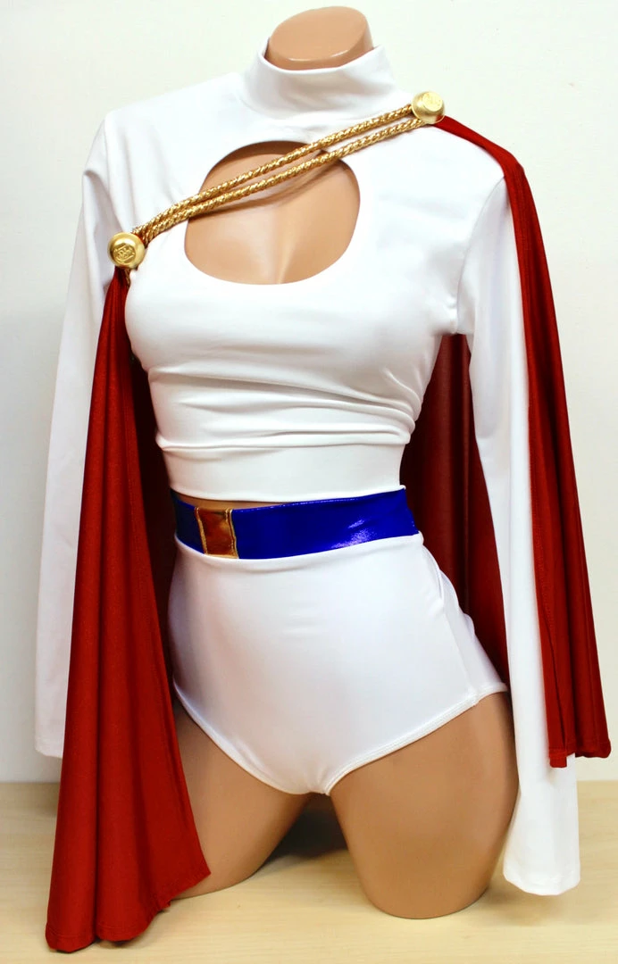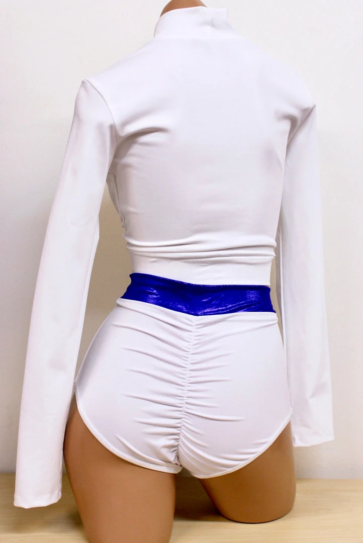 This super fun Power Heroine Costume Set has a long sleeve keyhole crop top that has just enough peekaboo for the cleavage. The shorts are high-waisted with an attached blue metallic belt with a gold buckle.