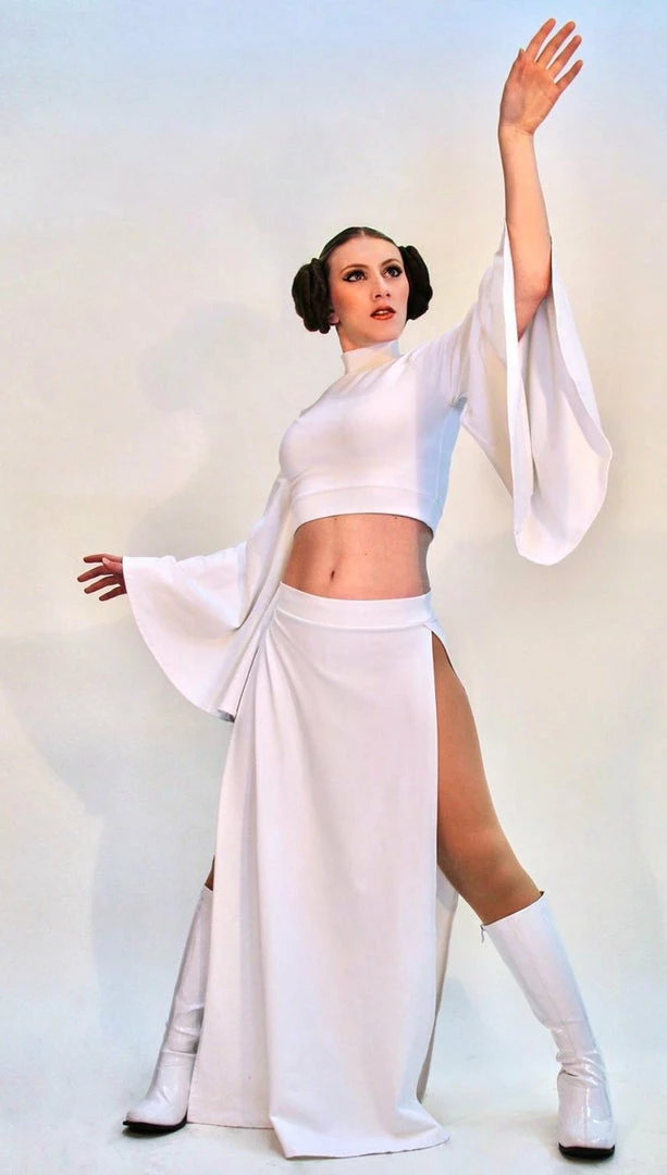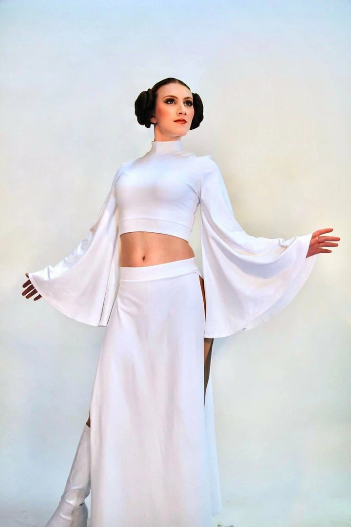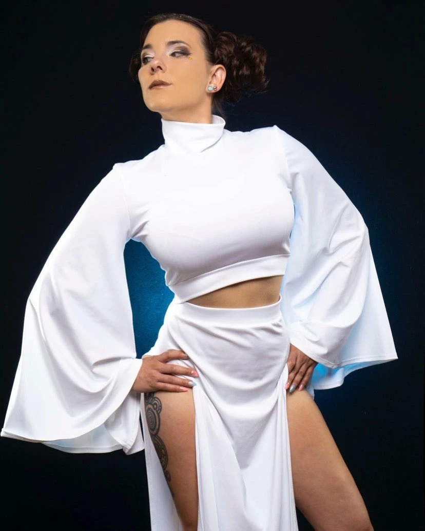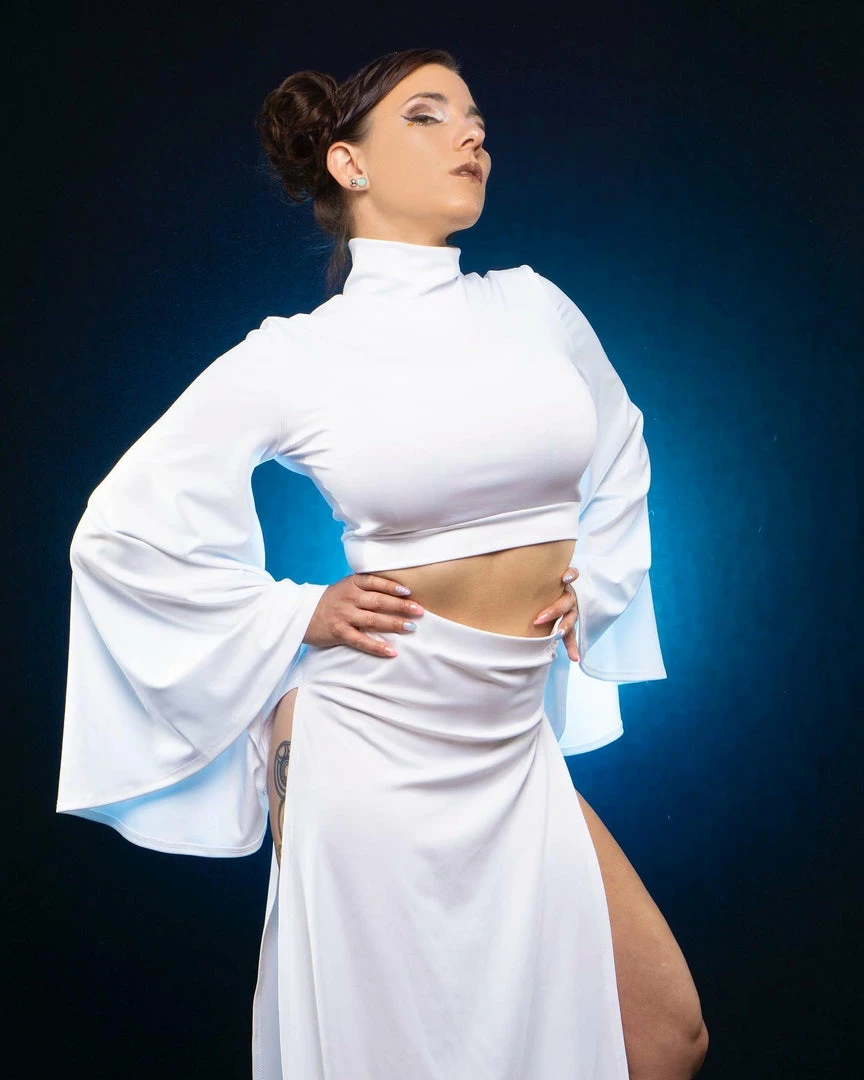 Our sexy Rebel Space Princess Costume is here and ready to fight! Our set comes with a mock turtleneck-style crop top with flare sleeves. The skirt has that Sugarpuss edge with ultra-high side slits! They are measured 4″ down from the waistband.Â