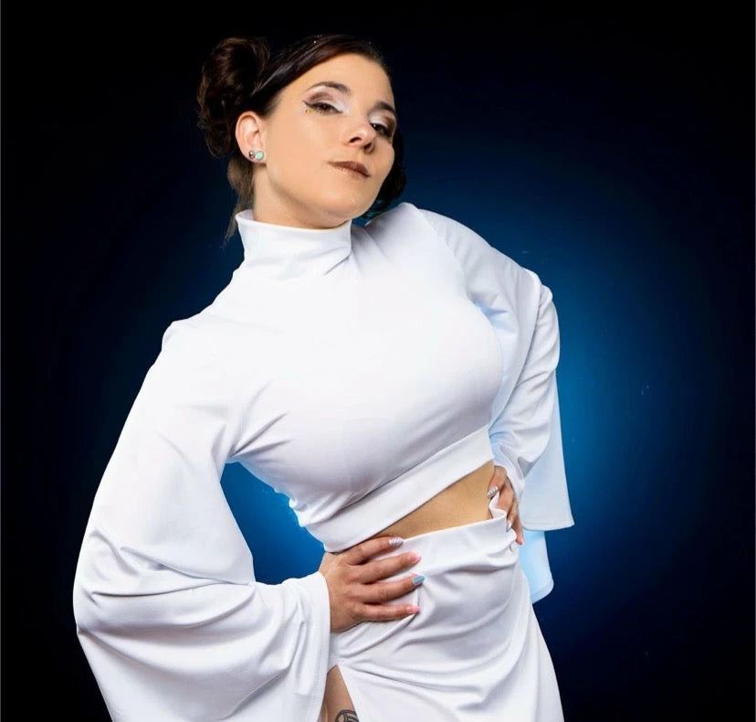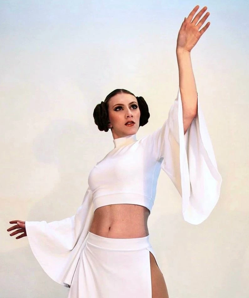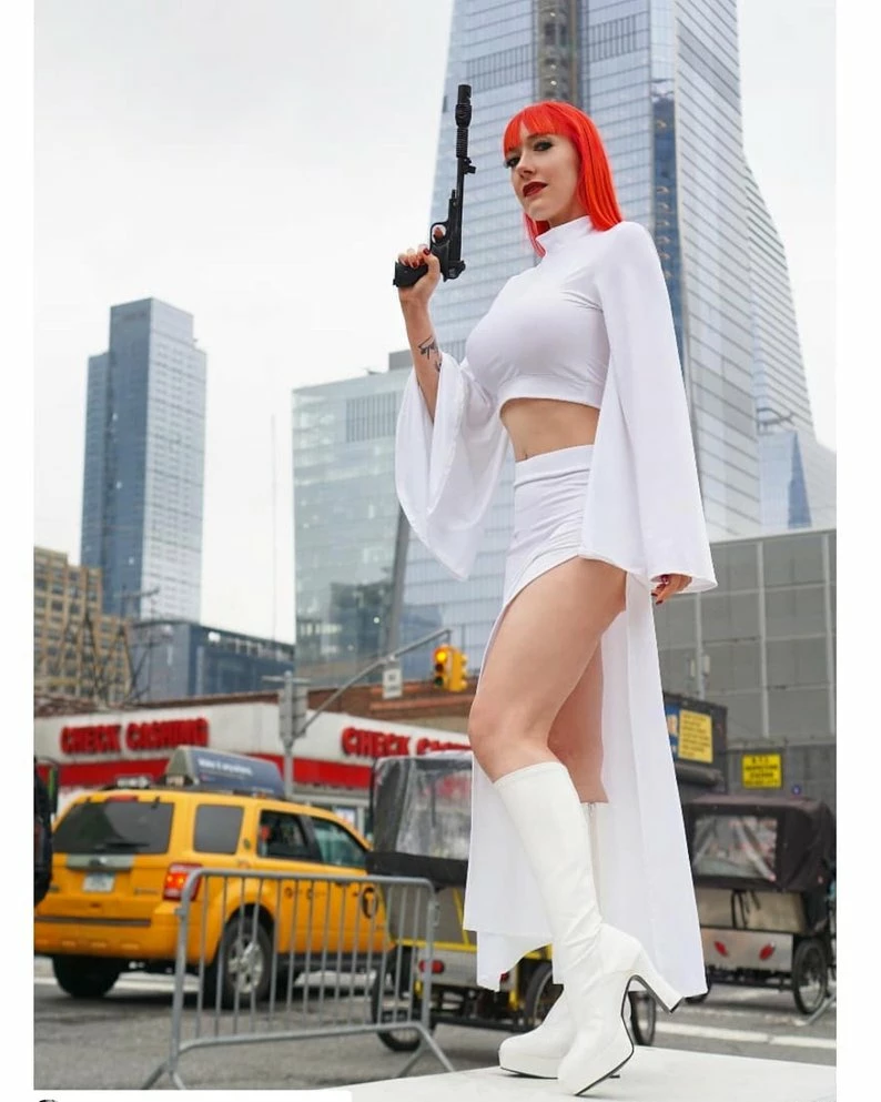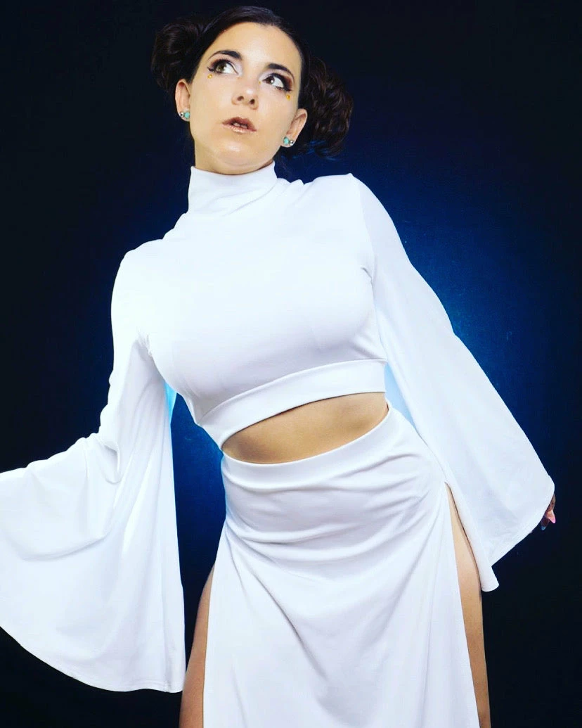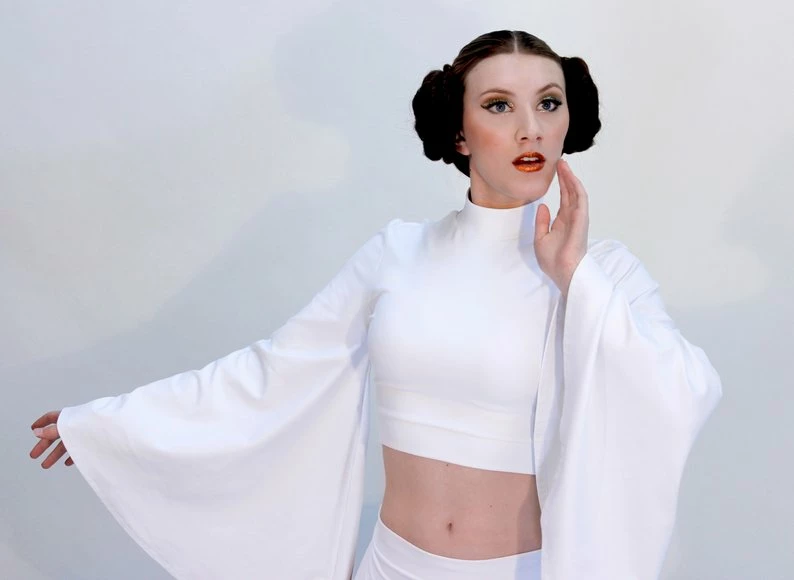 Our sexy Rebel Space Princess Costume is here and ready to fight! Our set comes with a mock turtleneck-style crop top with flare sleeves. The skirt has that Sugarpuss edge with ultra-high side slits! They are measured 4″ down from the waistband.Â