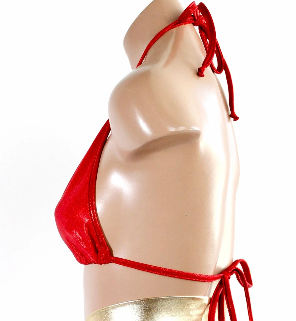 The top is a bikini triangle style top made from metallic red lycra with gold trim. We have made a new cut bottom with high cut sides and a red trim, 80’s style! The back is a thong cut, with red trim around the legs. Both the top and bottoms are lined. The bottoms come with a lasso loop attached and lasso rope