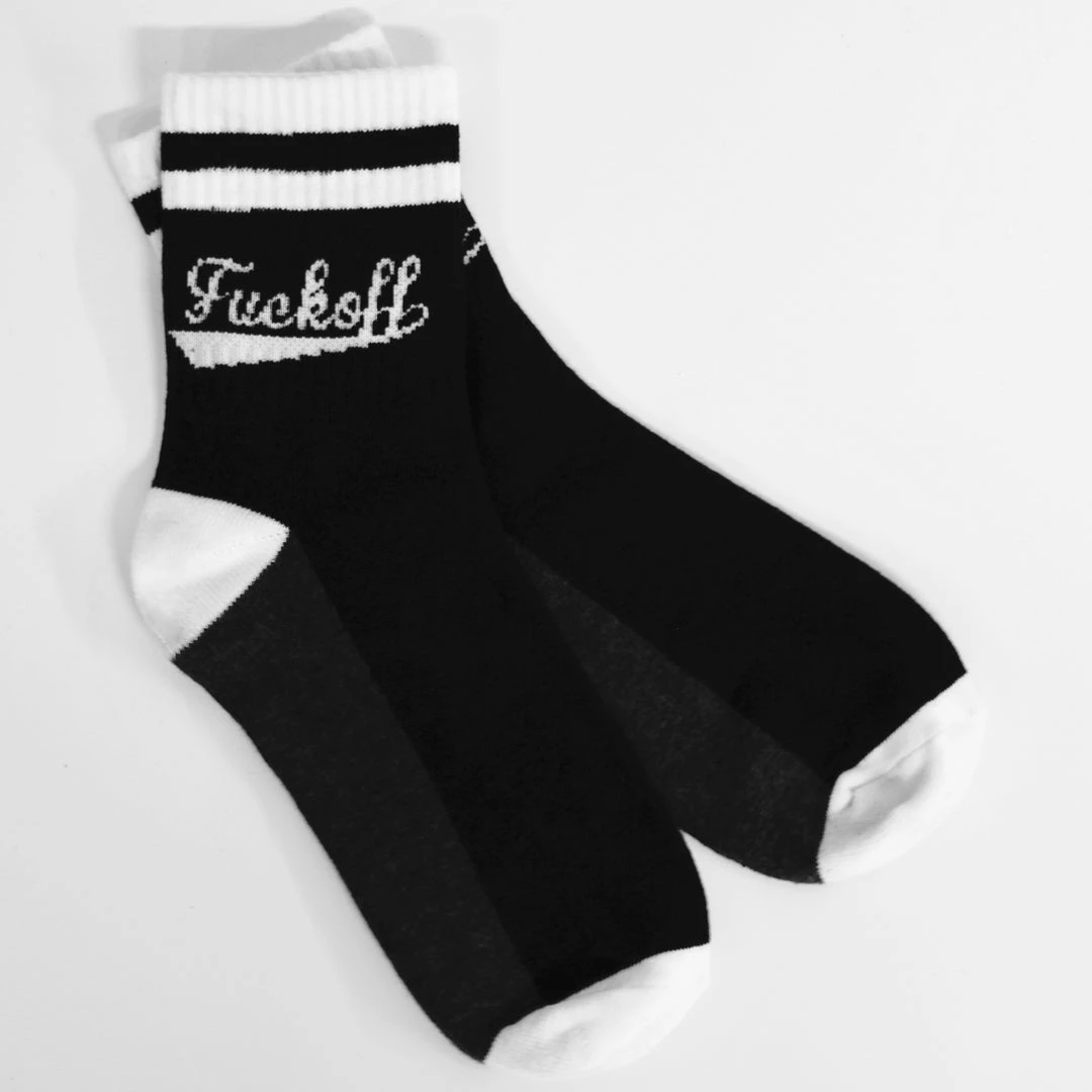 What? Yeah, we got the “F*ck Off” Socks you’ve been dreaming of. The hit just above the ankle and have the look and feel of comfy tube socks. Pair with our Sugarpuss Plaid Collection.