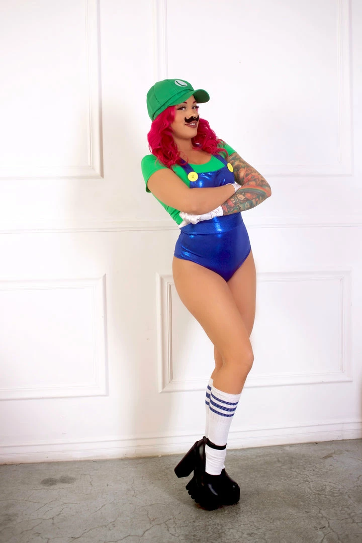 The bottom half has the high-waist cut and is VERY cheeky and sexy. The straps criss-cross in the back. We added the big yellow buttons to the front for that super gamer look. Comes with a green crop top! Order with or without Matching Hat.