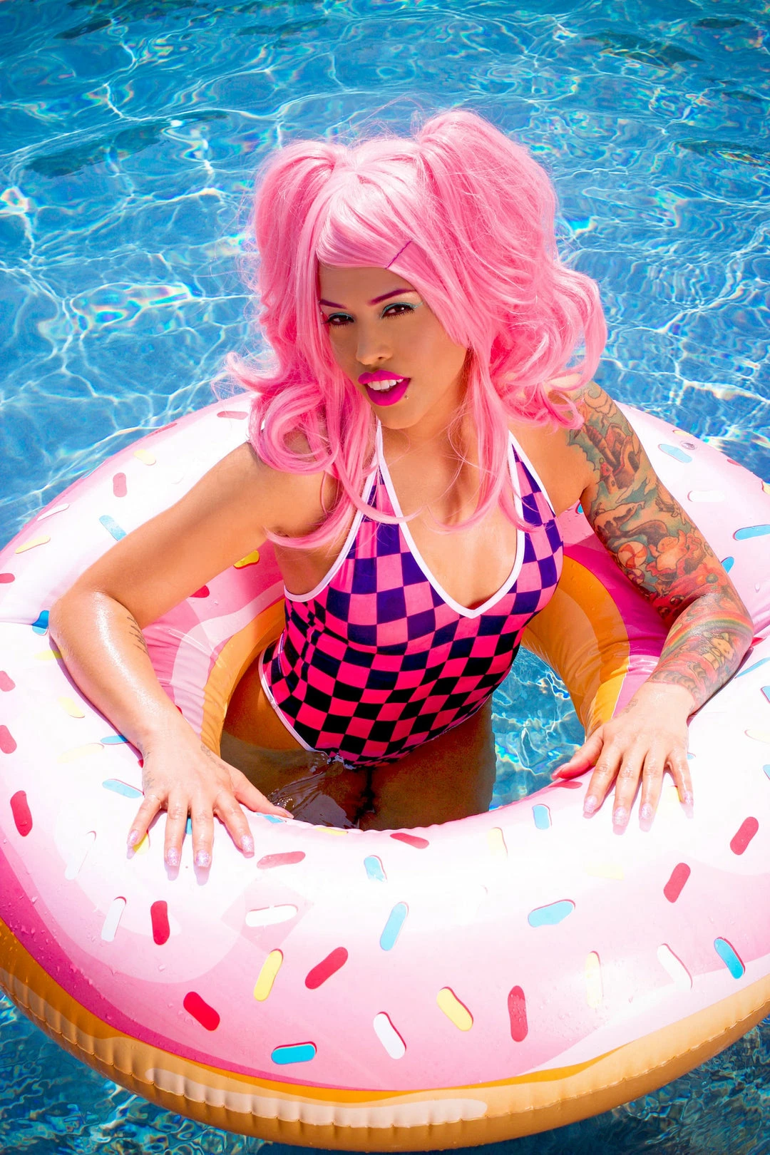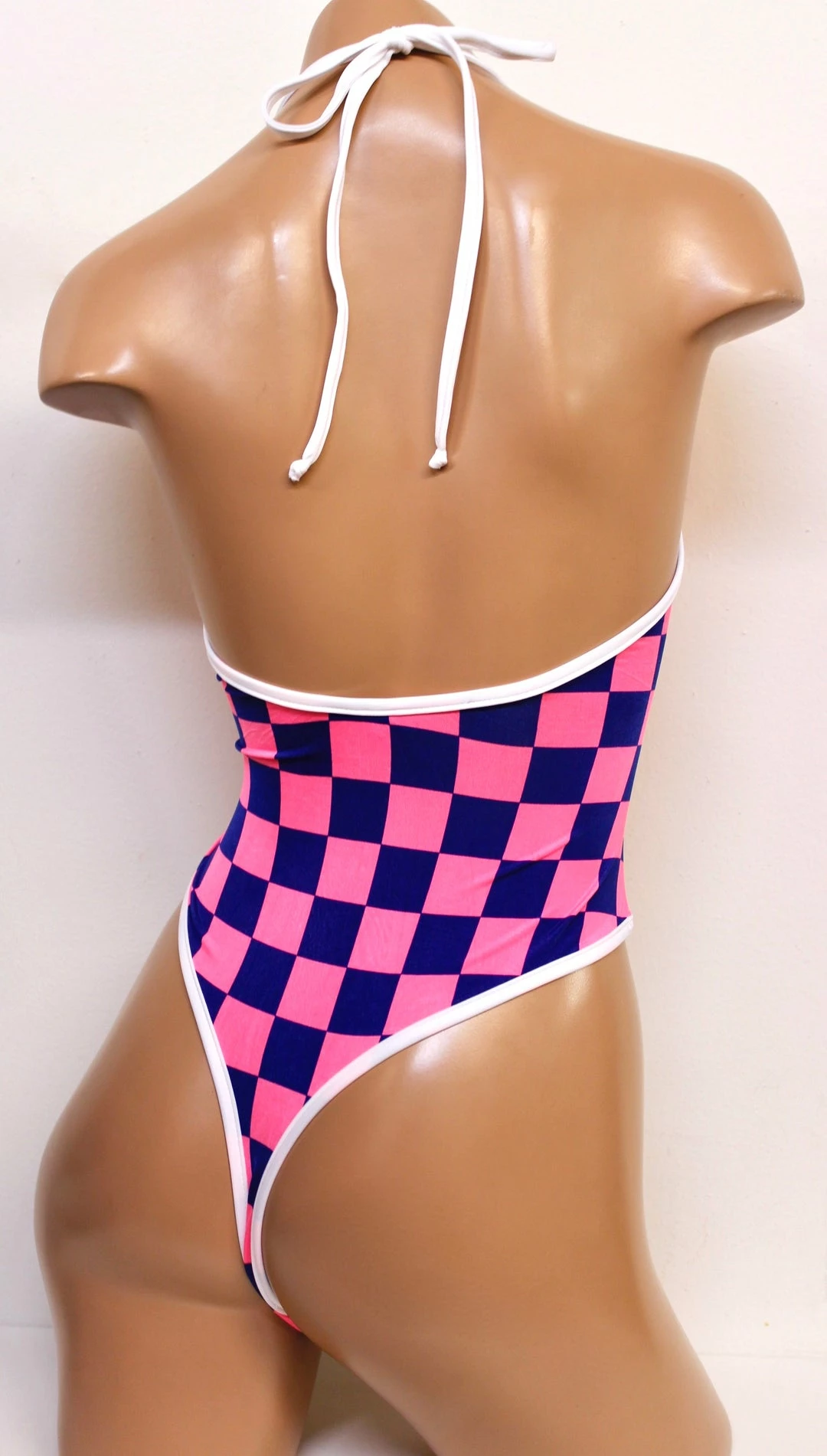 Neon Pink/Royal Blue Checkers with White Trim on our most popular bodysuit! It has a high cut on the leg showing a little more thigh for a sexier feel and ties around the neck. The bottom is cut with a thong back to give your booty more Va-Va-Voom!