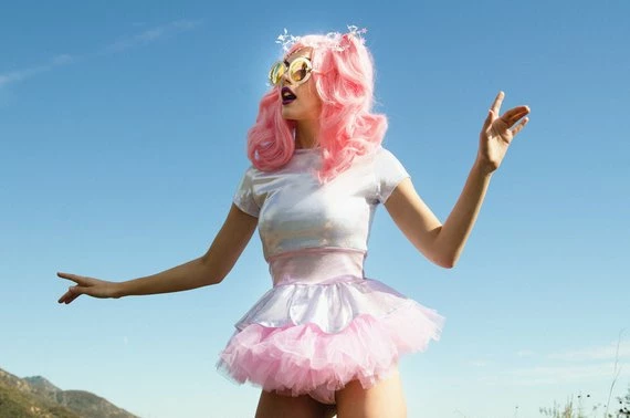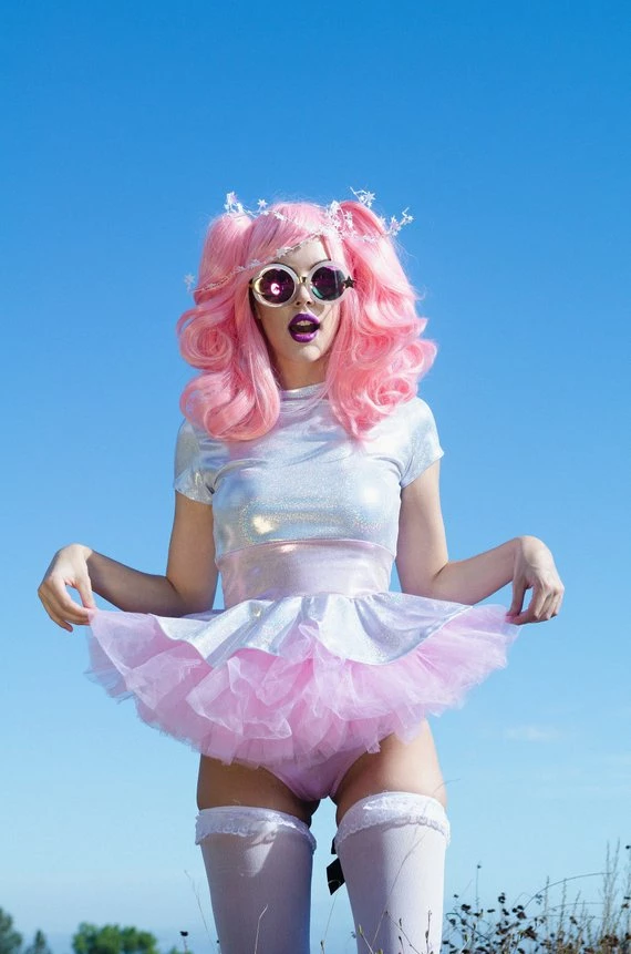 This top has short sleeves and cinches in at the waist. Peplum flares out for that “Jetson” look! Order with or without the Pink Tutu. Check our Hologram section for our various bottoms to match!