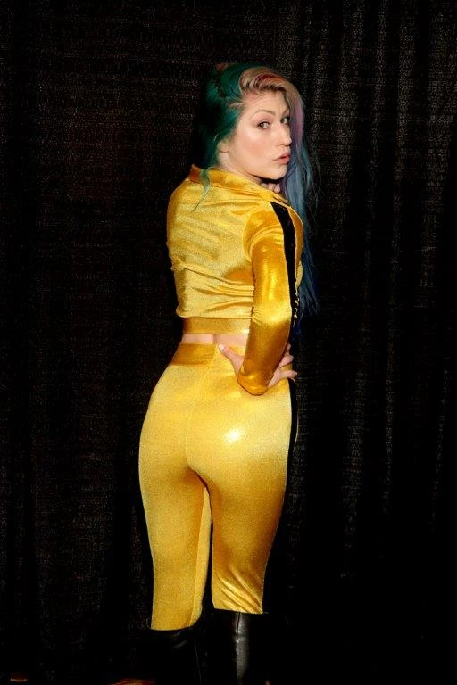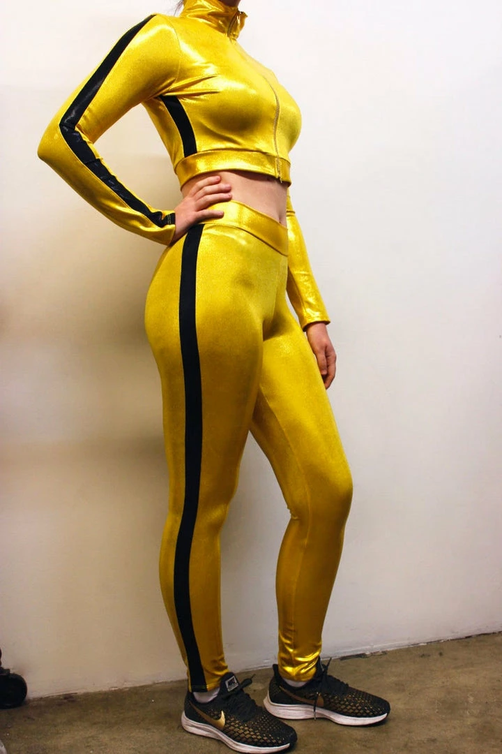 Our stand-out Sugarpuss Killer Assasin Leggings are cut at the belly button. The leggings have a tight, stretchy fit down to the ankle. The black stripes have been added to the sides for the full effect of our favorite female assassin!