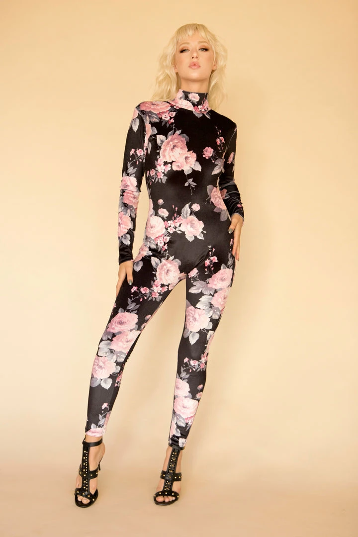 Our custom floral full-body catsuit has a high neck, long sleeves, and an open back. The bottom half fits like leggings and hits above ankles.