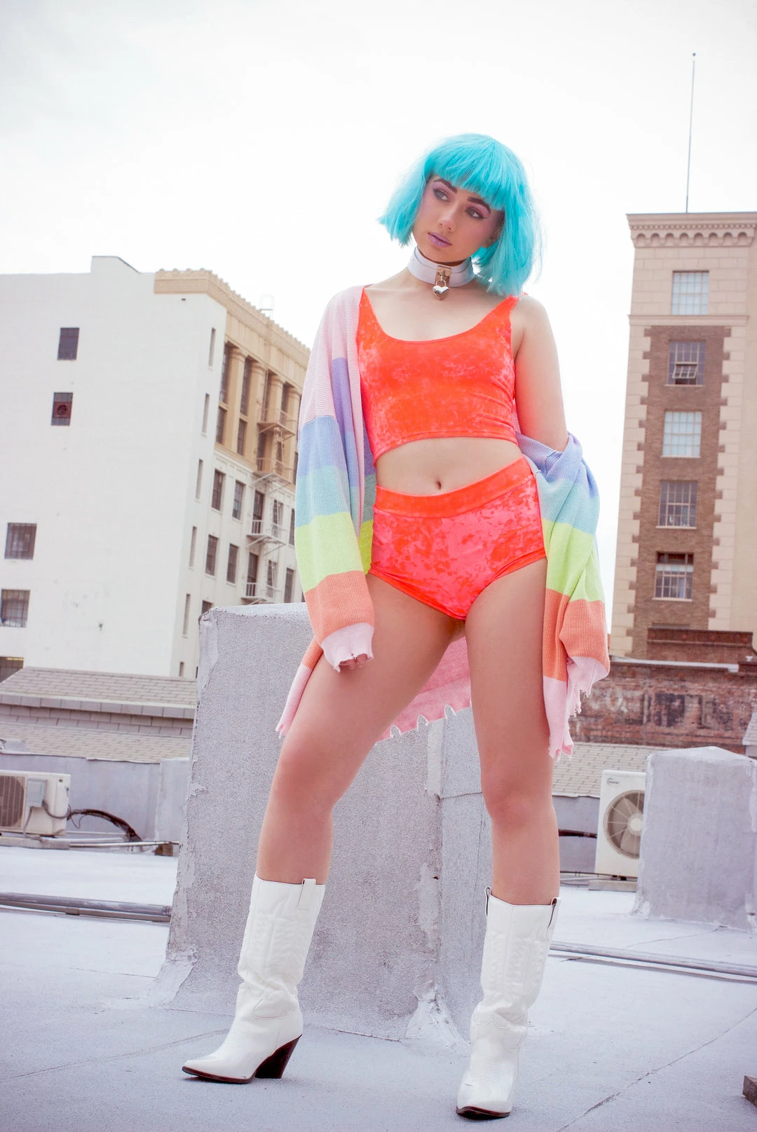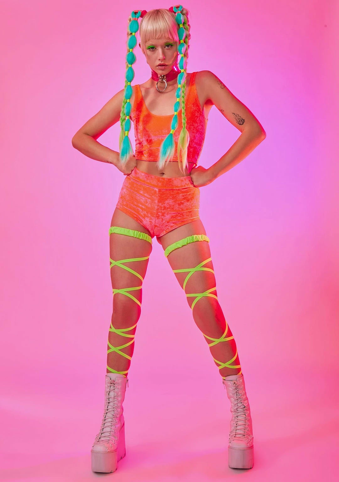 The Sugarpuss velvet high waist Cheeky Shorts are cut at the waist to hit just below the belly button. The back of the shorts have a perfect sexy fit which is cut to show a little cheek.