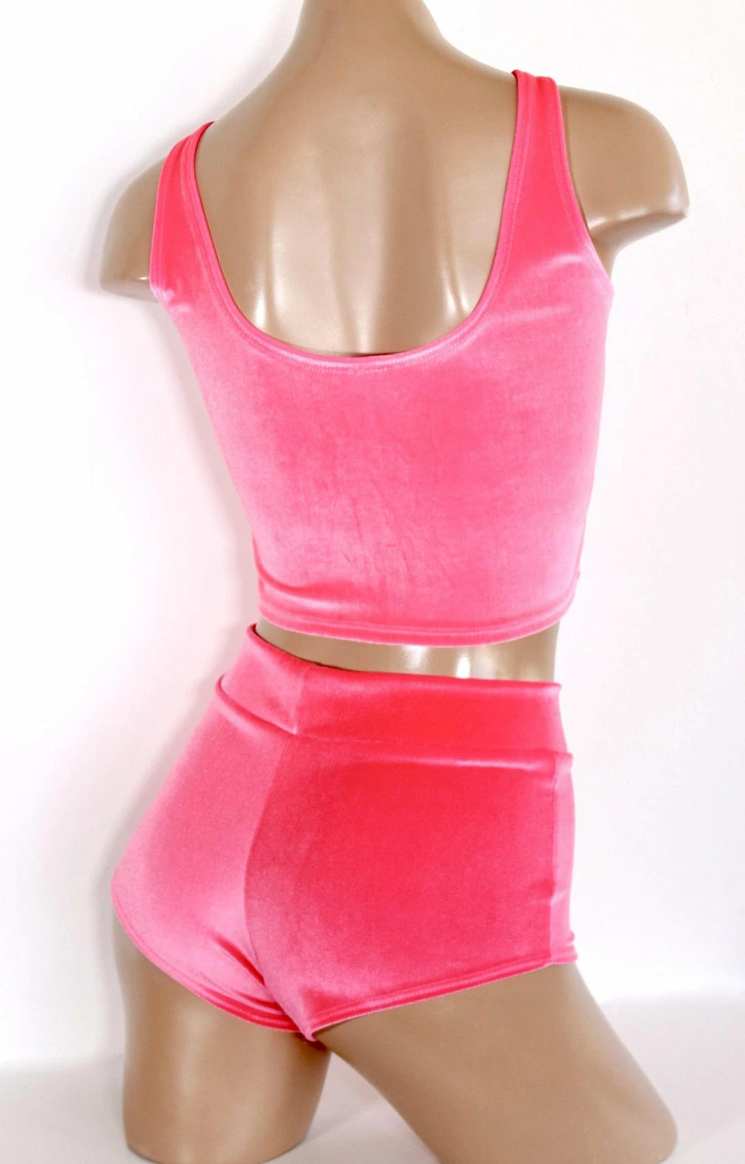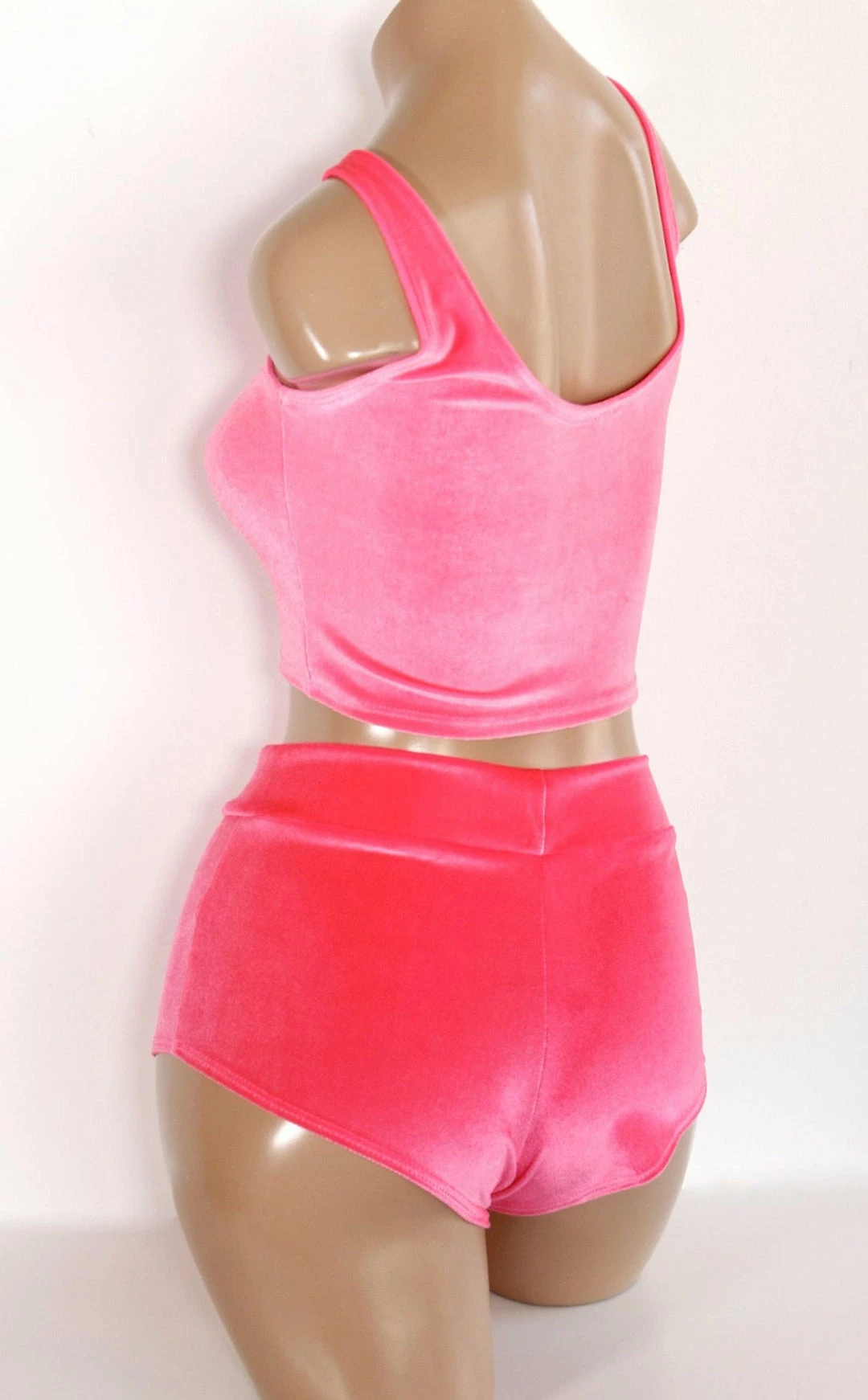 The Stretch Velvet High-waist shorts come in super soft and comfy 4-way stretch velvet. The waist hits at the belly button and the back is cut to show a little cheek.