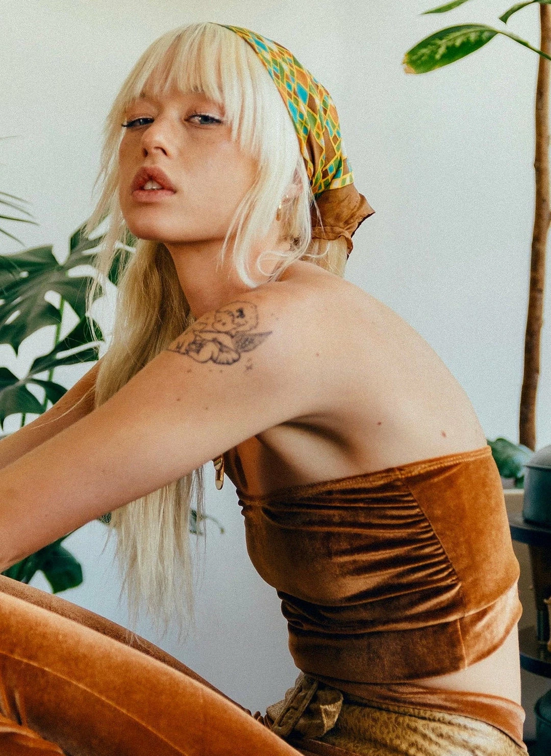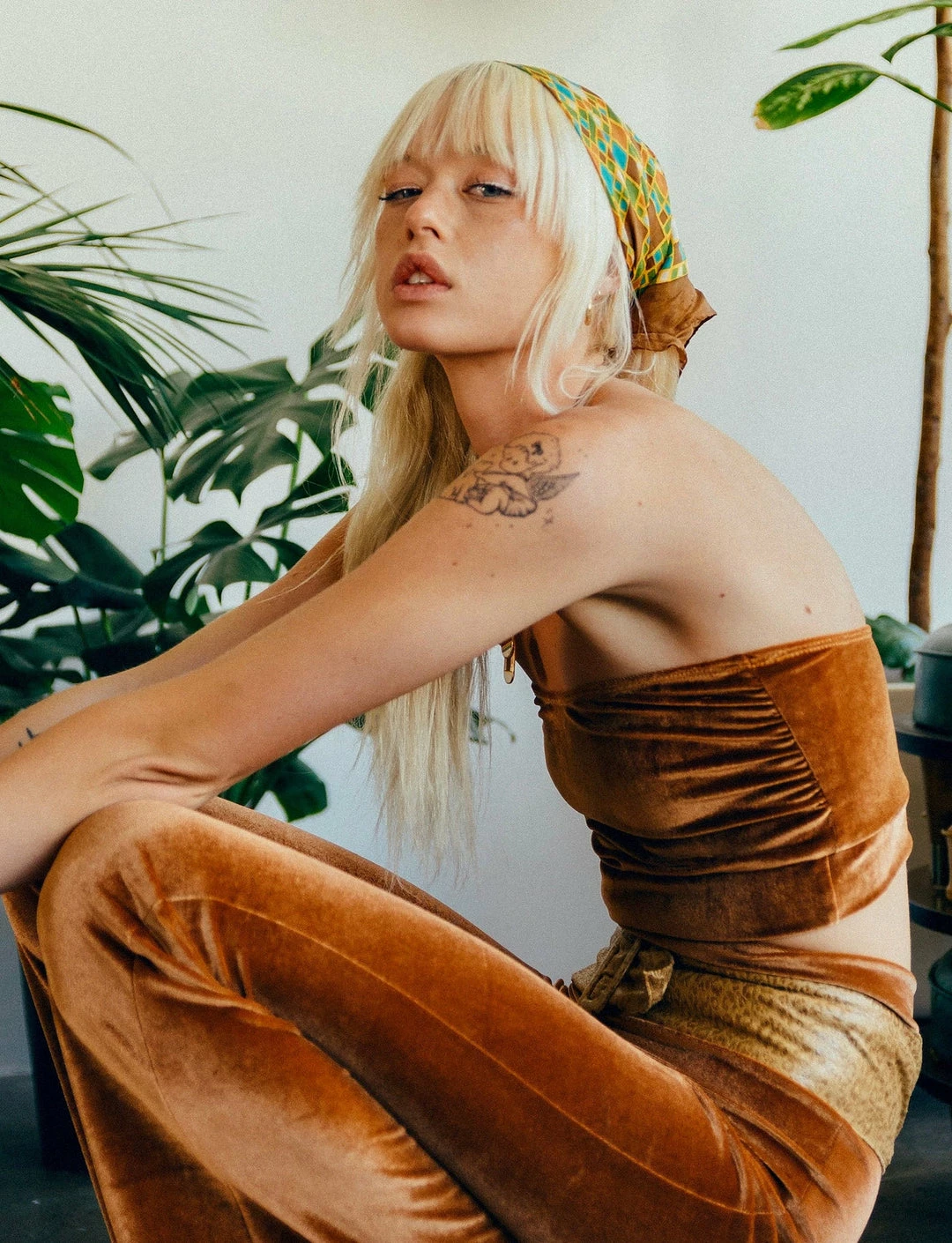 Yum! A plush caramel Tube Top, so 70’s!! Made to coordinate with our velvet bell bottoms! This fabric is so comfy and cozy!