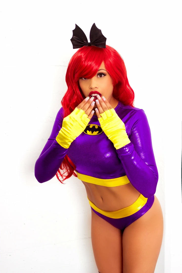 This unique and sexy Purple Bat Hero-inspired set gets its inspiration from the original Bat Superhero. The long sleeve crop top has a crew neck and a patch at the center front. The bottoms are a low-rise bottom, Brazilian cut, with a banded waist. This waistband allows for extra comfort without tight elastic.