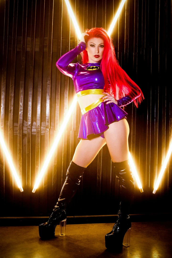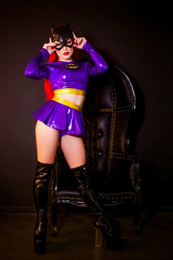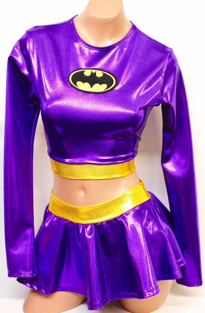 This unique and sexy Batgirl-inspired set gets its inspiration from the original Batgirl, Yvonne Craig. The long sleeve crop top has a crew neck and a patch at the center front. The bottom is a mini skirt with a banded waist. This waistband allows for extra comfort without tight elastic.