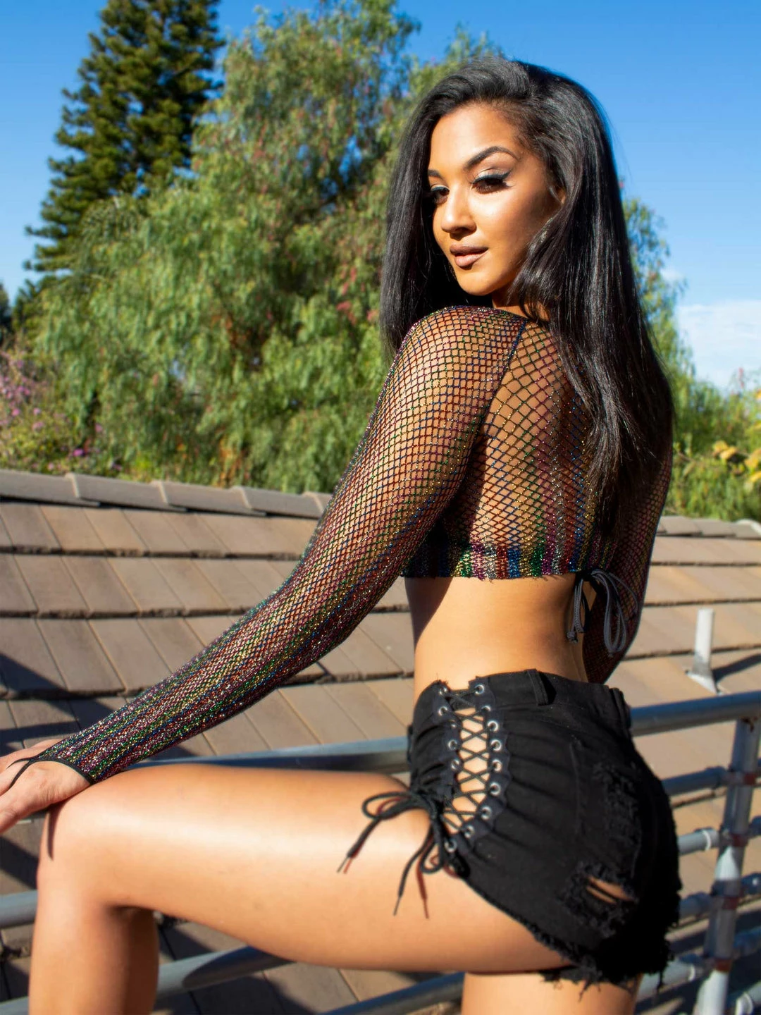 Rainbow lurex glitter long sleeve crop top is essential for summer. Perfect for layering! Would look adorable with any of our bottoms, skirts, or bikinis!