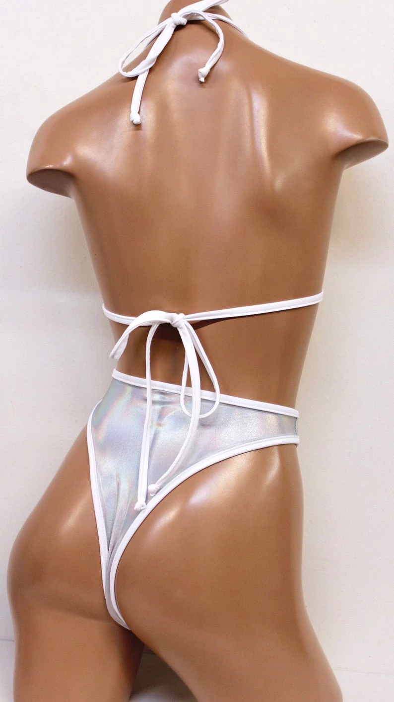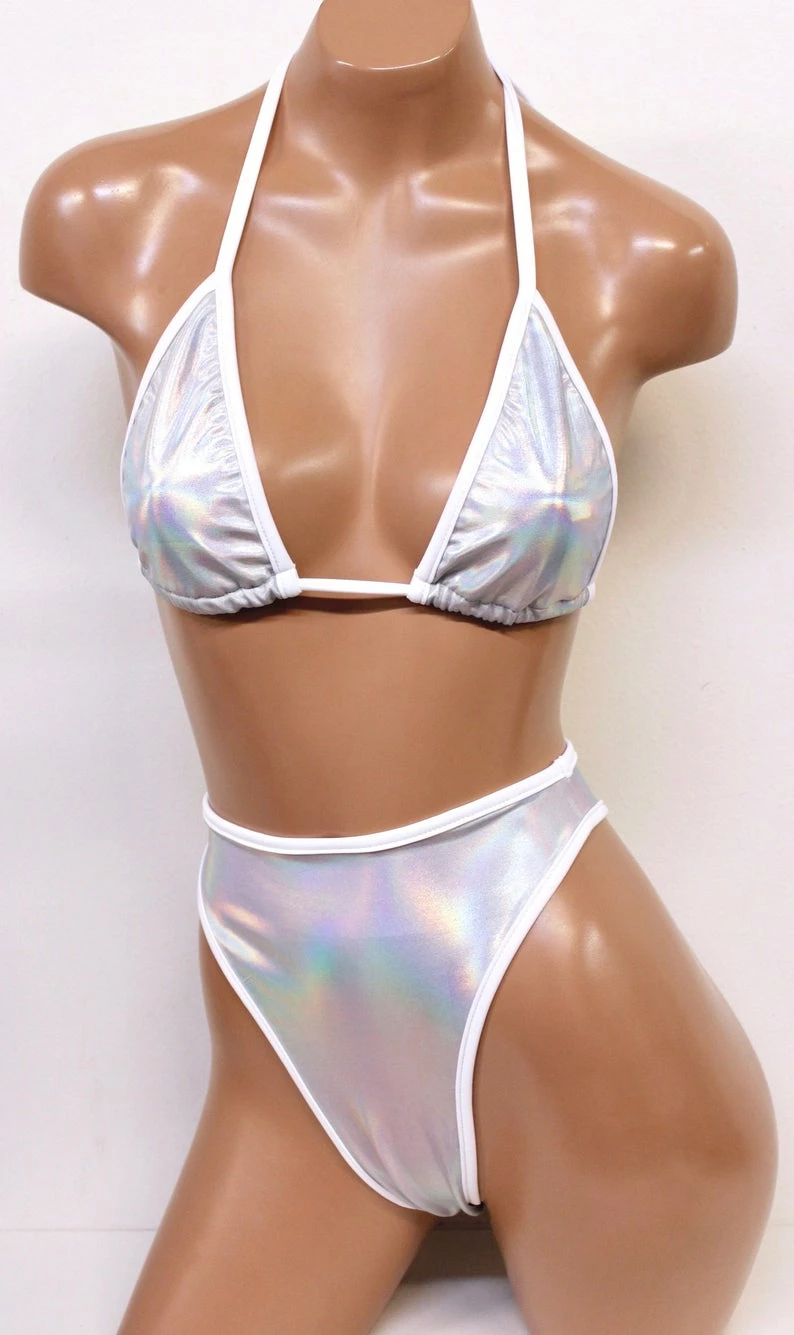 Our new Swimwear in head-turning Iridescent! Our Sugarpuss String Highcut Bikini is perfect for Summer. The set comes with a triangle top and highcut highwaist bottoms, with a thong back to make the booty pop!