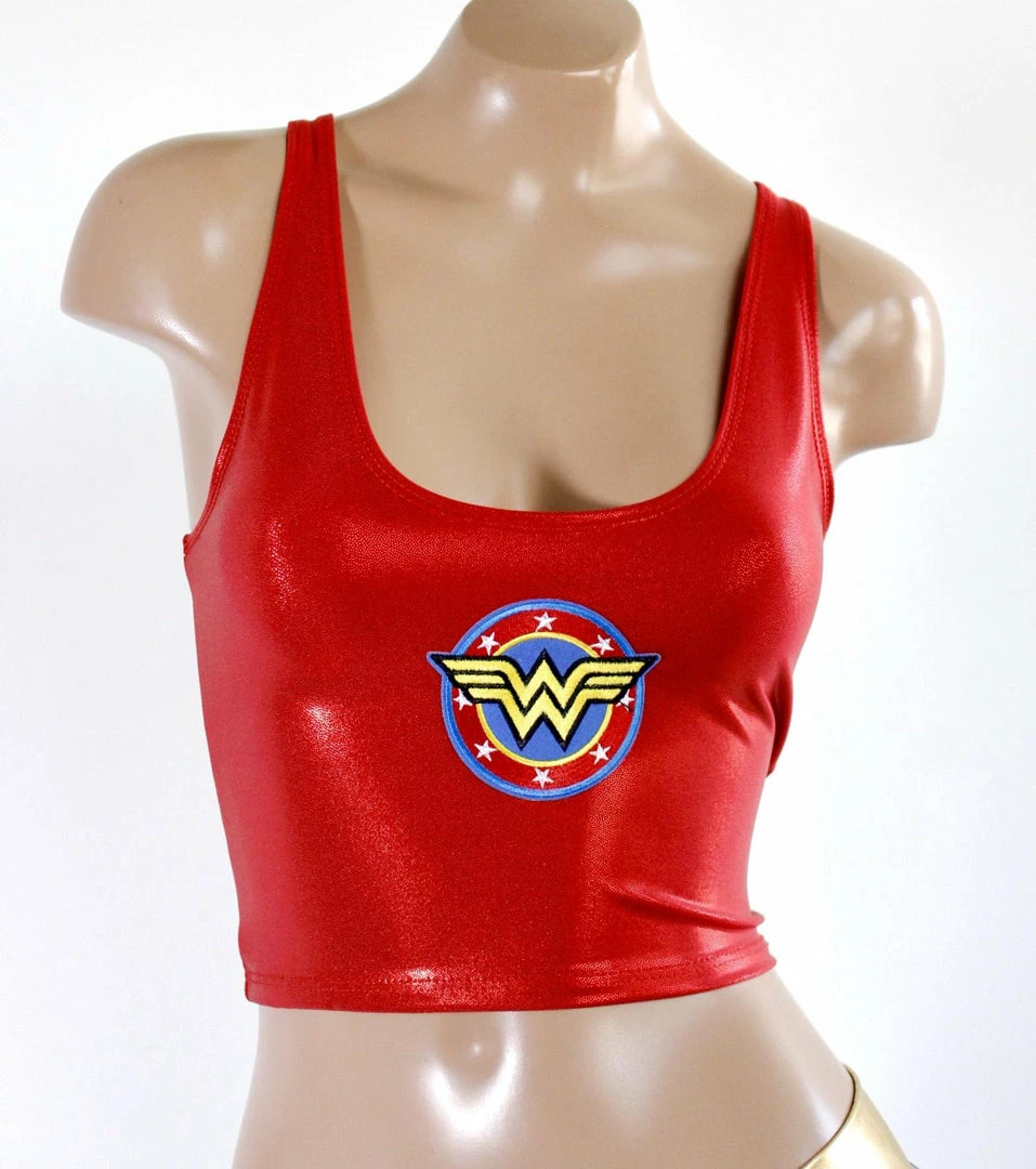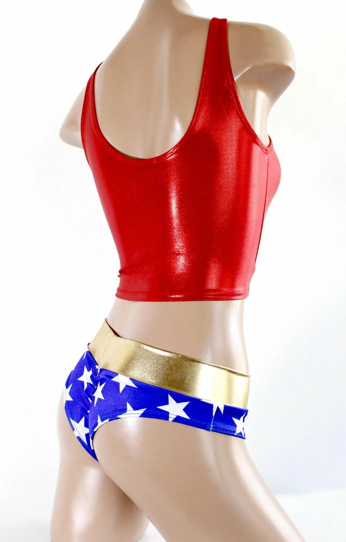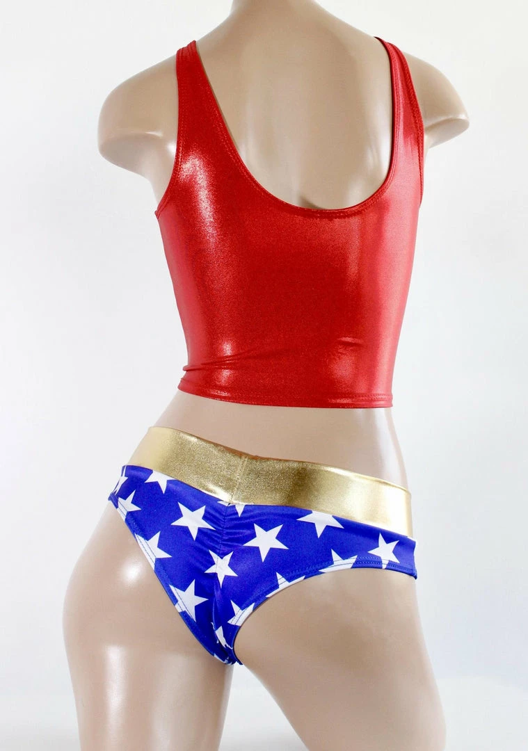 Sugarpuss has a brand new Star Superheroine set! Simple and sweet with our MATTE star lycra bottoms. Our set comes with the red metallic cropped tank with a Star Superheroine Logo patch sewn on. The Cheeky Shorts sit low-rise going across the hips with a scrunch in the back, very cheeky!!