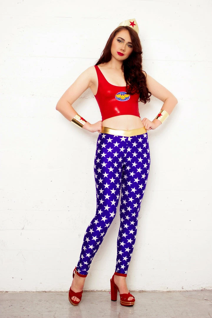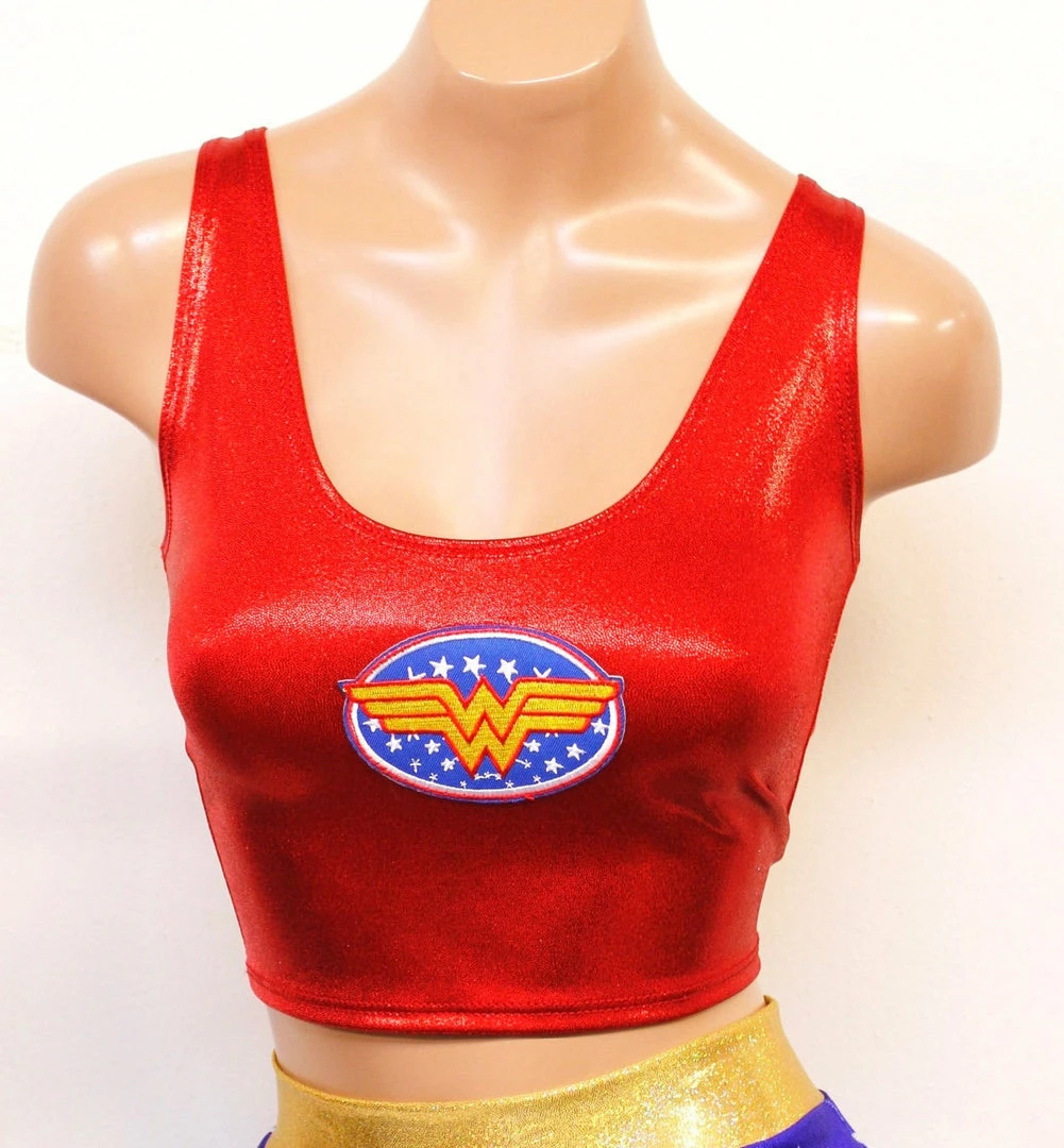 Match our comfy and stretchy Sugarpuss Crop Tank with any of our Star Superheroine bottoms! The sexy top is a crop tank with a scoop neck and is made from super stretchy metallic lycra. We have added a Star Superheroine Logo Patch to go with any of our other Star Superheroine pieces.