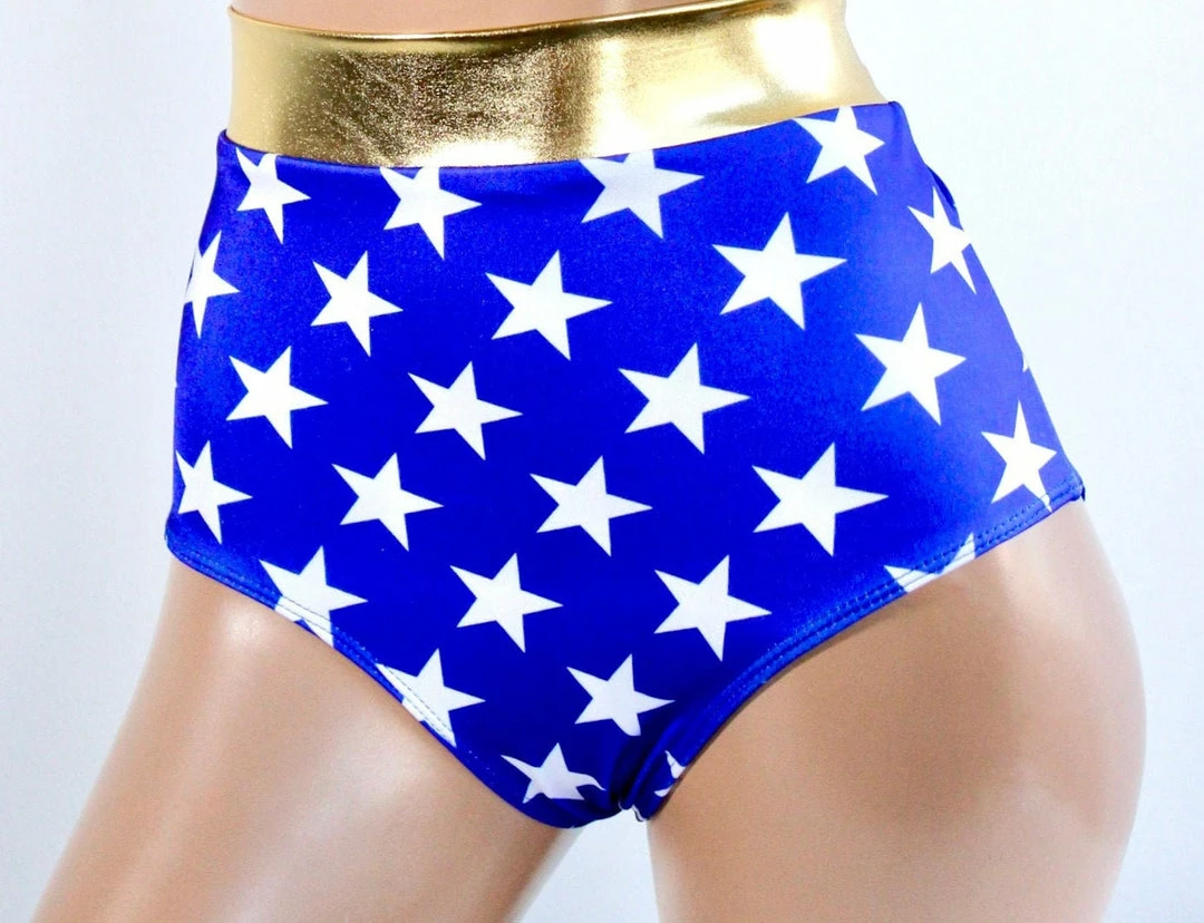Our Sugarpuss Star Superheroine Original Cut Briefs are a classic! There is a lining in the front panel, which means it could actually be worn as a swimsuit. The leg openings have a hidden elastic. These bottoms have the option to come with a loop for the golden lasso and the lasso.