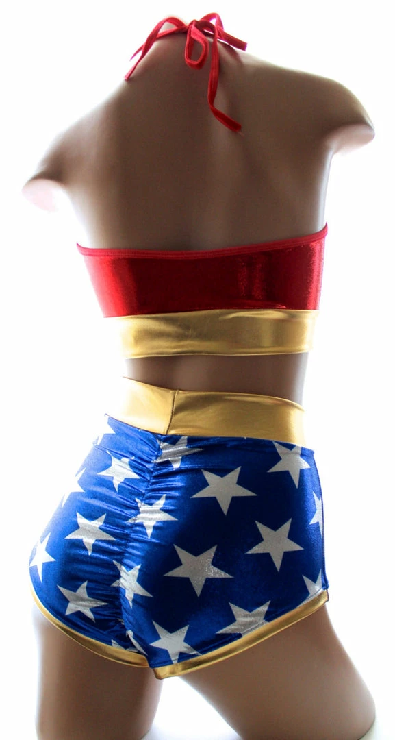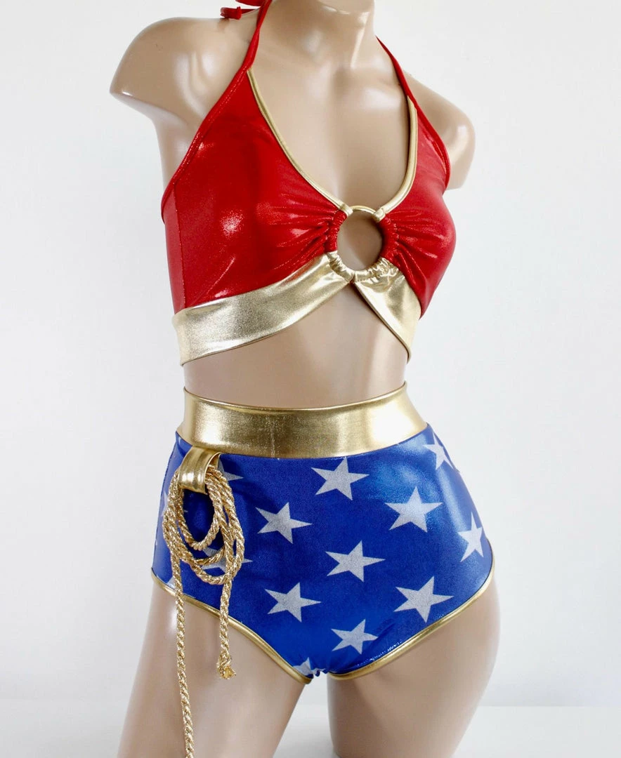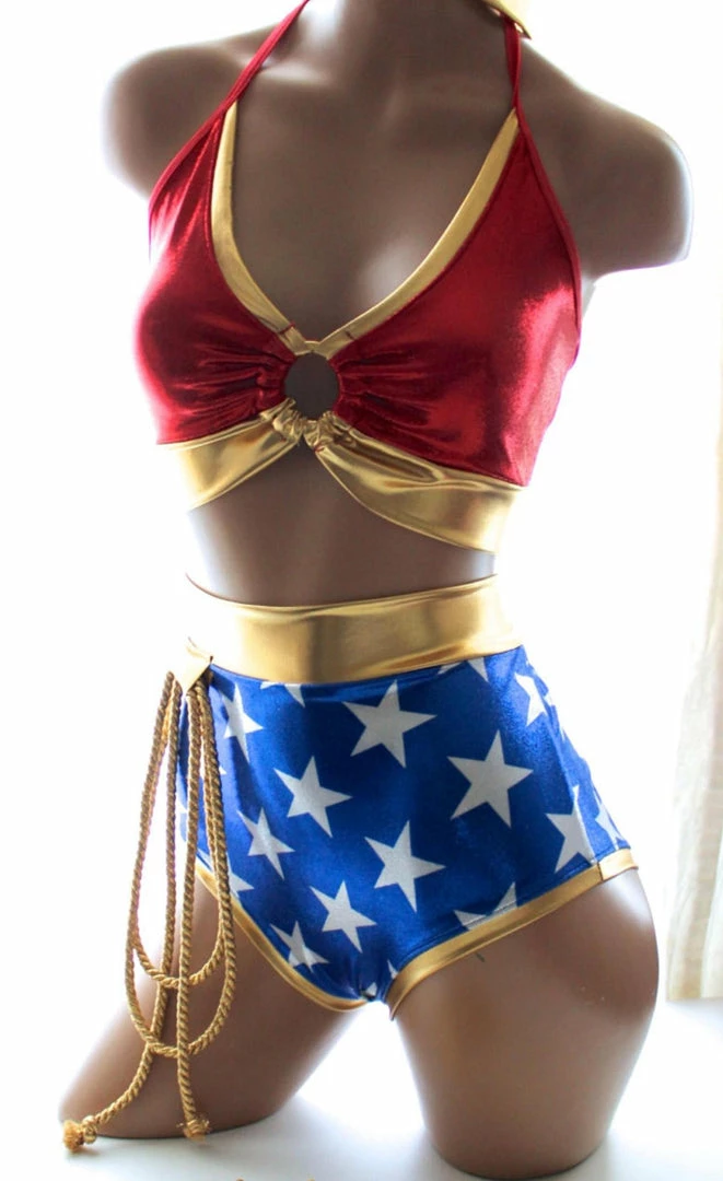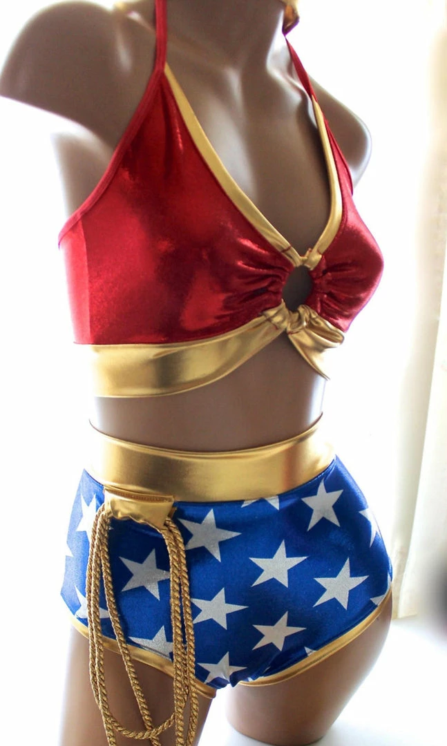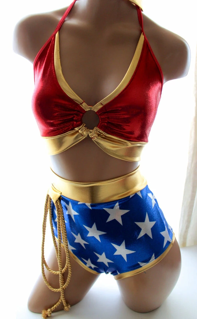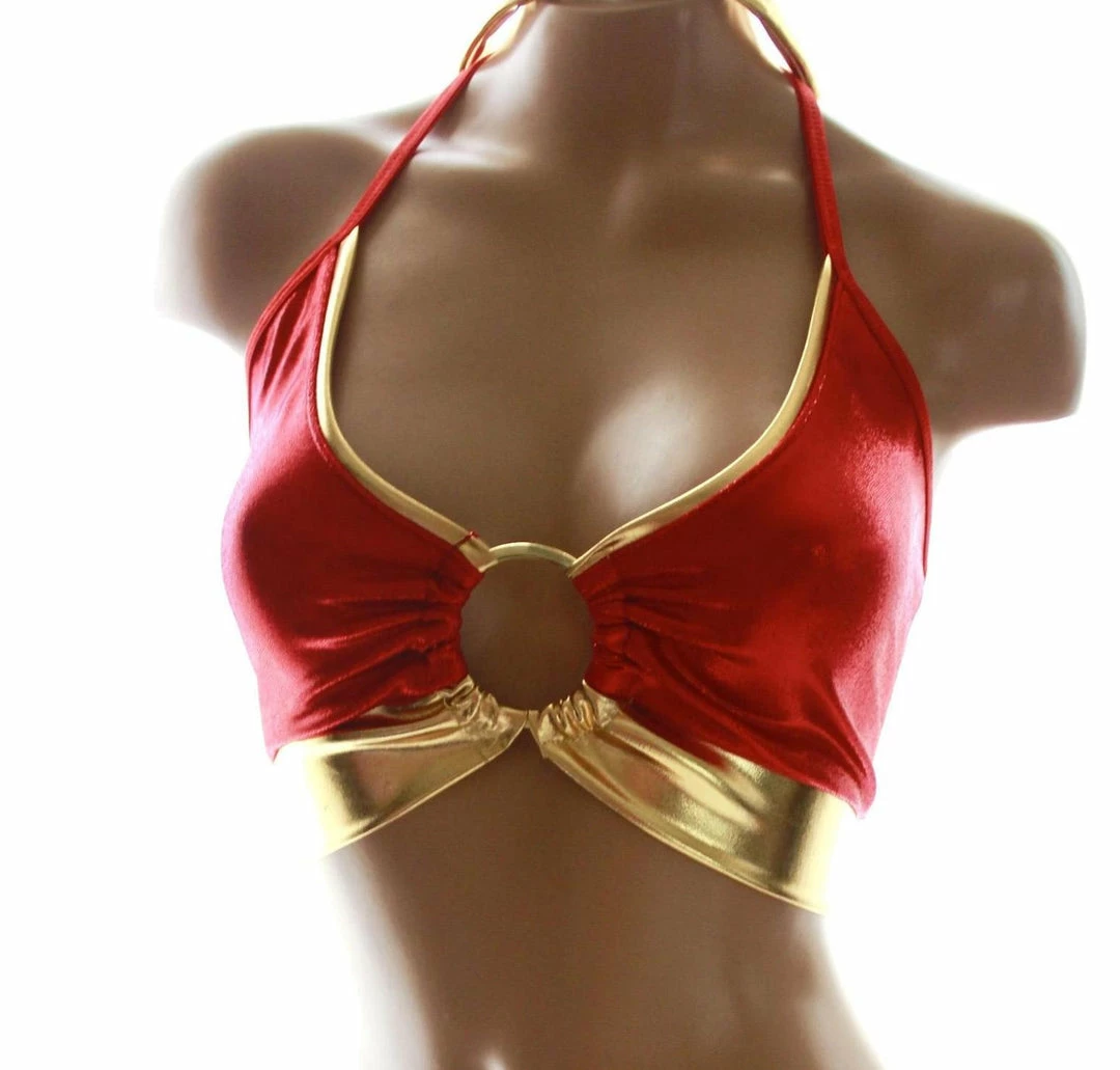 The top is a sporty bra halter top that ties at the neck, has a gold ring in the center front and has lining so can be worn without a bra. The bottoms are high-waisted with ruching on the back, gold trim around the legs.