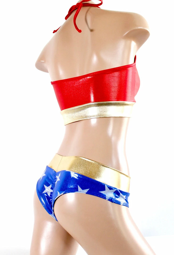 This set has our Sporty Ring Bra Top with great coverage that is cinched on the center with a gold ring and trimmed in gold lycra.