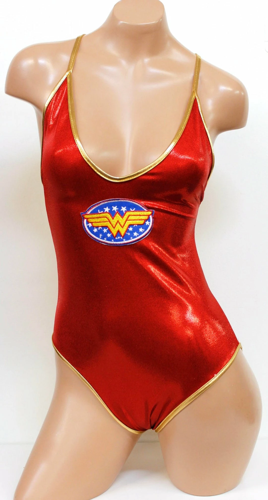 This amazing Star Superheroine-inspired bodysuit takes one of the most popular of our Sugarpuss bodysuits and one-pieces and marries it with our most popular Star Superheroine costume! The halter neckline has a deep V in the front trimmed in the gold metallic and ties in the back in a criss-cross. The back has a scrunched Rio back to give extra curves. There is a unique Star Superheroine Patch on the center front.