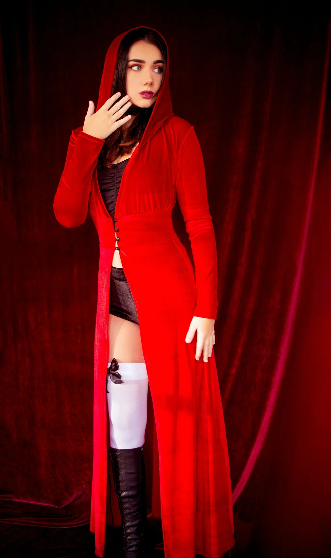 Our most popular Hooded Duster Robe Coat is now available in Red Velvet!! It drapes down to the ankles, cinches in with buttons at the waist, and has a gorgeous full hood. Create your own Little Red Riding Hood look or a red witchy look for Halloween. This will stand out in the crowd and be so unique! Also, check our entire collection of velvet items and find something to match!